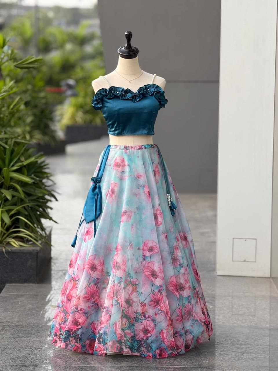 Lehenga – Pure organza silk digital printed lehenga with a grand 8-meter flair, finished with canvas patta for beautiful structure